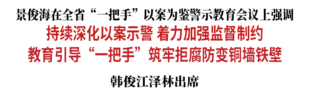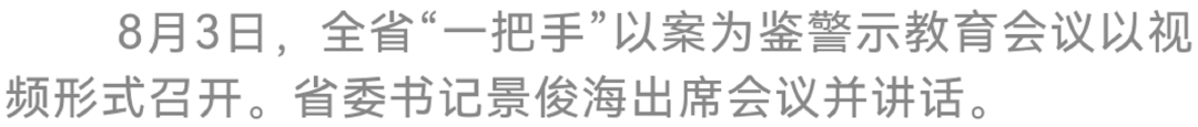 8月3日,全省“一把手”以案为鉴警示教育会议以视频形式召开。省委书记景俊海出席会议并讲话。他强调,要深入贯彻习近平总书记关于加强对“一把手”和领导班子监督的重要论述,持续深化以案示警,着力加强监督制约,教育引导“一把手”筑牢拒腐防变铜墙铁壁。省委副书记、省长韩俊,省政协主席江泽林出席会议。