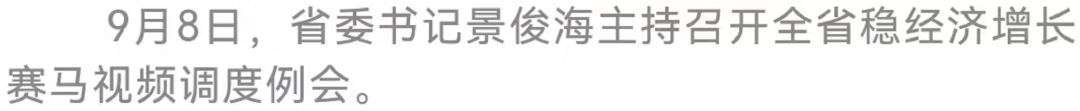9月8日,省委书记景俊海主持召开全省稳经济增长赛马视频调度例会。他强调,要深入贯彻习近平总书记视察吉林重要讲话重要指示精神,坚持稳字当头、稳中求进,全面实施“一主六双”高质量发展战略,统筹推进“六新产业”发展和“四新设施”建设,持续夯实经济增长基础,坚定不移推动高质量发展。省委副书记、省长韩俊作综合点评。省政协主席江泽林出席会议。