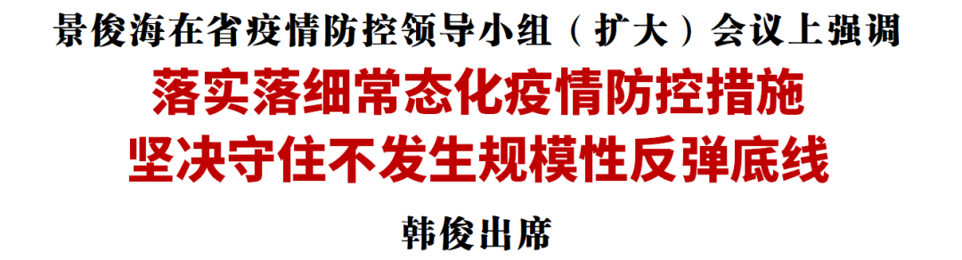 会上,省直有关部门汇报工作情况。副省长安立佳提出具体要求。景俊海指出,本轮疫情发生以来,长春市和相关部门同时间赛跑、与病毒较量,用11天时间实现了确诊患者和无症状感染者“双清零”。但当前还没到可以松口气、歇歇脚的时候。各级党委、政府必须毫不动摇坚持“外防输入、内防反弹”总策略和“动态清零”总方针,压紧压实“四方责任”,严格落实“四早”和“四应四尽”要求,坚决筑牢疫情防控屏障。一是监测预警要主动灵敏,扎实开展人、物、环境等多渠道监测,确保社会面安全有序流动。二是外防输入要坚决彻底,紧盯口岸、机场、冷链运输等重点领域、薄弱环节和返(来)吉重点人群,进一步强化检验、管控、消杀等措施。三是内防反弹要严密到位,落实好学校、工地、福利机构、监所等重点场所防控措施,严格执行重点人群日检测制度,严防发生聚集性疫情。四是核酸检测要严格规范,常态化开展核酸筛查,认真落实“落地检”措施,为防控疫情提供精准数据支撑。五是应急机制要高效管用,全面激活疫情防控指挥体系,持续加强应急资源储备,一旦出现疫情要及时发现、有效处置、尽快扑灭。六是防疫发展要统筹兼顾,精准管住极少数、科学放开大多数,坚决防止简单化、一刀切、层层加码,坚决做到疫情要防住、经济要稳住、发展要安全。韩俊强调,要坚决守住外防输入关口,严密细致做好口岸、机场、火车站等场所排查管控,坚持“落地即检”、关口前移,坚决阻断疫情传播扩散链条。对隔离点和定点医院要严防死守,派驻防控监督员开展巡回检查,坚决防止“破环”和外溢。要慎之又慎做好高校疫情防控,严格日常核酸检测,出现疫情要快速响应、以快制快。要强化工地疫情防控,完善应急预案,把常态化疫情防控措施落实到位。省委常委同志,省政府负责同志,省直有关部门及各市(州)、长白山保护开发区、梅河口市、各县(市、区)负责同志在各会场参会。(黄鹭 于小博)
