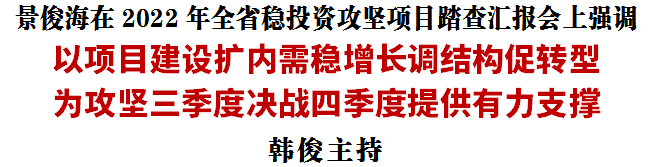 9月15日,2022年全省稳投资攻坚项目踏查汇报会以视频形式召开。省委书记景俊海出席会议并讲话。他强调,要深入贯彻习近平总书记重要讲话重要指示精神,坚持项目为王、企业为本、环境为要、投资为先,以项目建设扩内需、稳增长、调结构、促转型,为攻坚三季度、决战四季度提供有力支撑。省委副书记、省长韩俊主持会议。