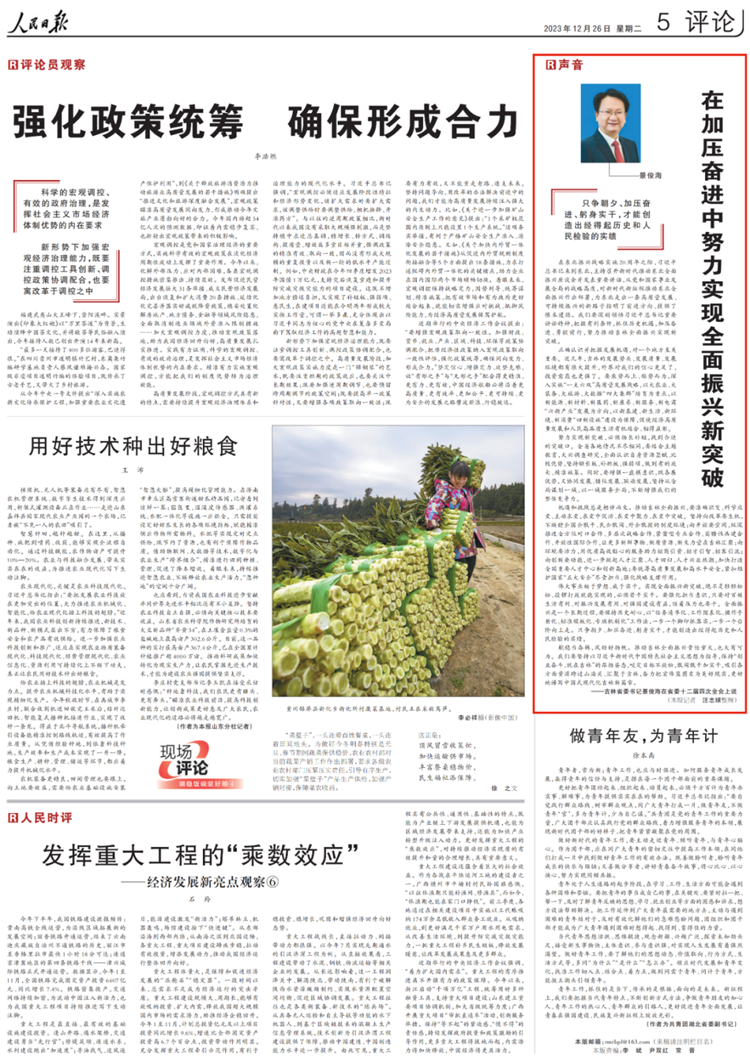 舵稳当奋楫,风劲好扬帆。推动吉林全面振兴责任重大,也大有可为。我们要坚持以习近平新时代中国特色社会主义思想为指导,保持“创业奋斗、就在吉林”的昂扬姿态,咬定目标不放松,敢闯敢干加实干,吸引各方面资源跨过山海关、汇聚于吉林,奋力把宏伟蓝图变为美好现实,更好地谱写中国式现代化吉林新篇章。
