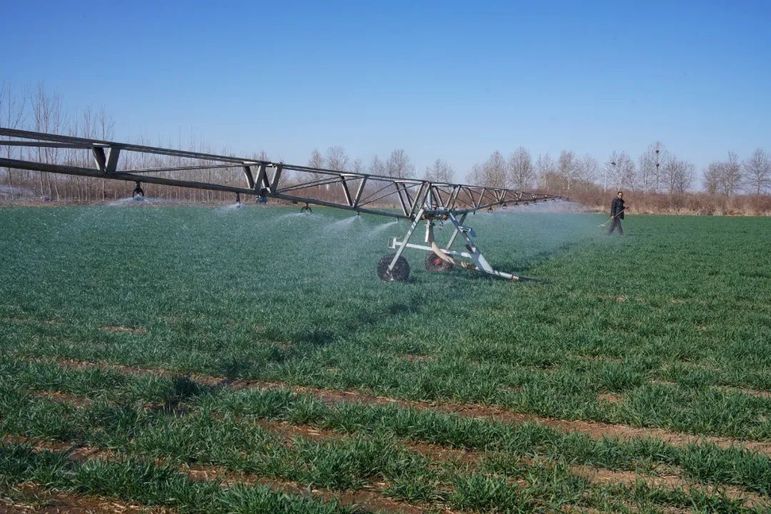 山东淄博 农民利用喷灌设备为冬小麦浇水