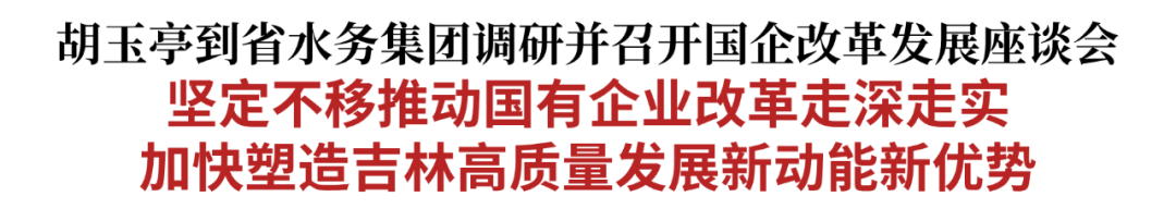 8月5日,省委副书记、省长胡玉亭就深化国企改革等工作到省水务集团调研,并主持召开国企改革发展座谈会。他强调,要深入学习贯彻习近平总书记在听取吉林省委和省政府工作汇报时的重要讲话精神,落实省委全会安排部署,纵深推进国企改革深化提升行动,对标一流争先进位,深耕主业强身健体,深化改革培植优势,主动化解历史遗留问题,持续增强国有企业核心功能、提升核心竞争力,为吉林高质量发展塑造新动能新优势。王子联、刘伟参加有关活动。